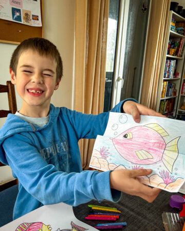Puis, j’ai dessiné le contour du bocal et Maxine a pu méticuleusement peindre (je l’ai aidé sur les contours quand même) avec de l’aquarelle. Le résultat est plutôt sympa, et les deux Loulous sont contents de leur œuvre en commun !