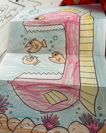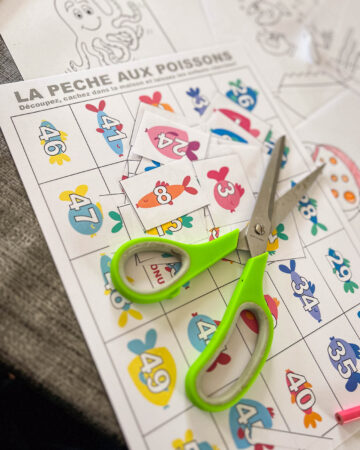 Le poisson qui dévore tout : Ensuite, et parce qu’on l’a déjà fait plusieurs fois et que les loulous adorent ça, nous avons imprimé sur le site de allomamandodo (une de mes bibles préférées !), des poissons qui dévorent tout. On imprime le tout pour les loulous, et c’est parti !