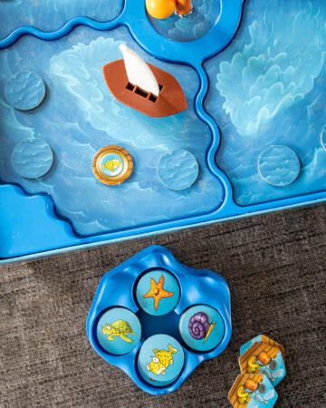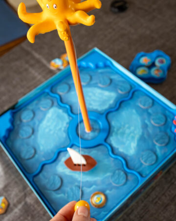 SOS Octopus : Un jeu que les enfants aiment particulièrement, un peu mémory qui fait avancer un bateau tout autour du plateau pour récupérer des objets. Et si on tombe sur la maman Poulpito, il faut utiliser le mât central avec une boule au bout pour décaniller le bateau ! SOS Octopus, que je conseille dès 4 ans. On ne le trouve pas forcément partout, je vous met un lien sur un site où je l’ai trouvé pendant l’écriture de cet article.