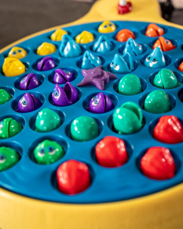 La pêche en jeux de société : Je n’ai pas tellement de jeux sur les poissons :-p Et bien chez Goliath si, parce qu’on l’a et que même moi je galère à attraper ces coquinous de poissons. Un petit jeu où le plateau tourne et il faut pêcher les petits poissons qui ouvrent et ferment leurs bouches pour attraper l’hameçon.